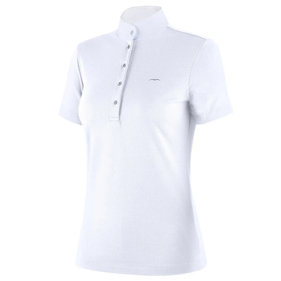 Animo Basilea Show Shirt in white is a ladies short sleeve show shirt with classic polo shirt styling. The soft pique knit is cool and stretchy and is easy to tuck into breeches or jeans. Women’s Animo riding shirt has a white stand up collar in a crisp polyester/cotton blend. The collar also has a stock loop at the back. The front of the Basilea Show Shirt has an Animo logo created with small faceted metallic studs, an elegant nod to the classic polo shirt chest logo.