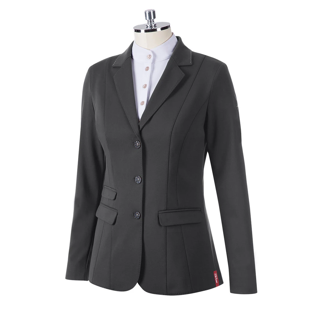 - Small crystal detailing adorns the jackets collar, pockets, and back seam