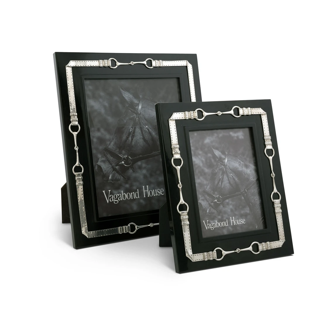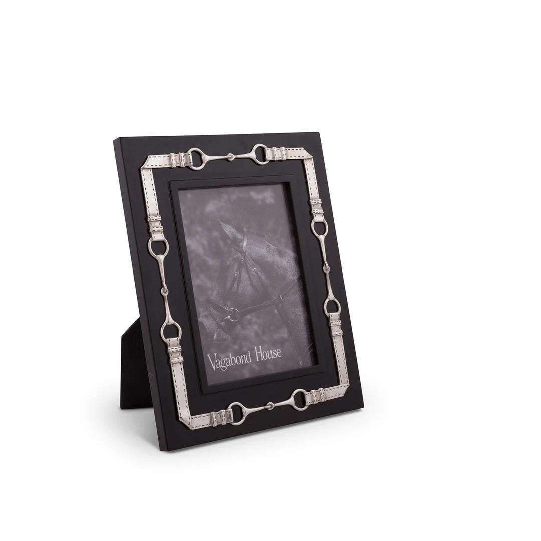 Frame your favorite Equestrian in our luxurious black wood photo frame embellished with pewter egg butt snaffle bits joined by detailed leather bridle straps in a repeating pattern.