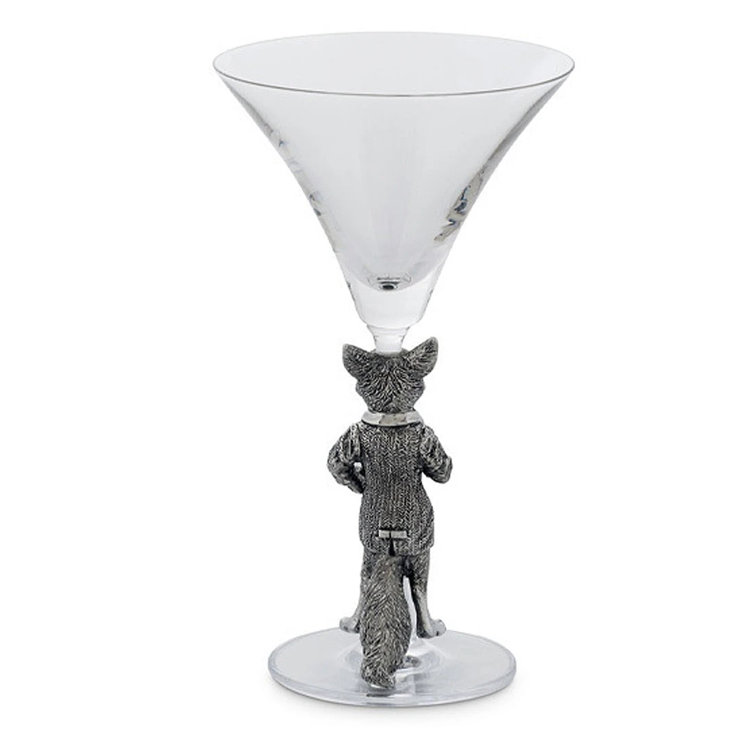 Serve drinks in these Dressed Fox cocktail glasses at your next social gathering. Each stem and base of this eye-catching glass is handcrafted from pure pewter that is completely food-safe and FDA-compliant, and measures 4.75 x 4.75 x 8 inches. The hand-cast, intricately designed standing fox is whimsically dressed in a suit jacket, facing forward with one hand on hip, head lifted with pride and pointed ears raised, evoking a wonderful conversation starter for your guests. The clear, handblown glass bowl is the perfect size for holding a generous martini cocktail.