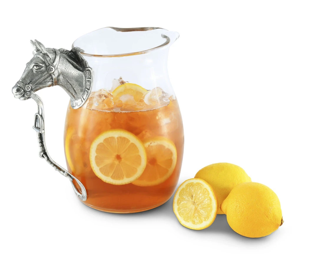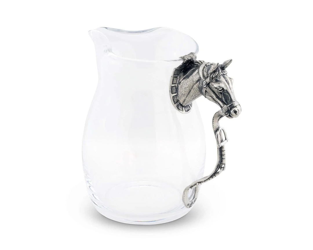 A thoroughbred’s head extends horizontally from the glass as its intricate mane wraps around the pitcher’s rim. A thick, figural strap attaches under the horse’s muzzle before winding towards the base to complete the handle. The pure-pewter design displays incredible realism in its exquisite form.