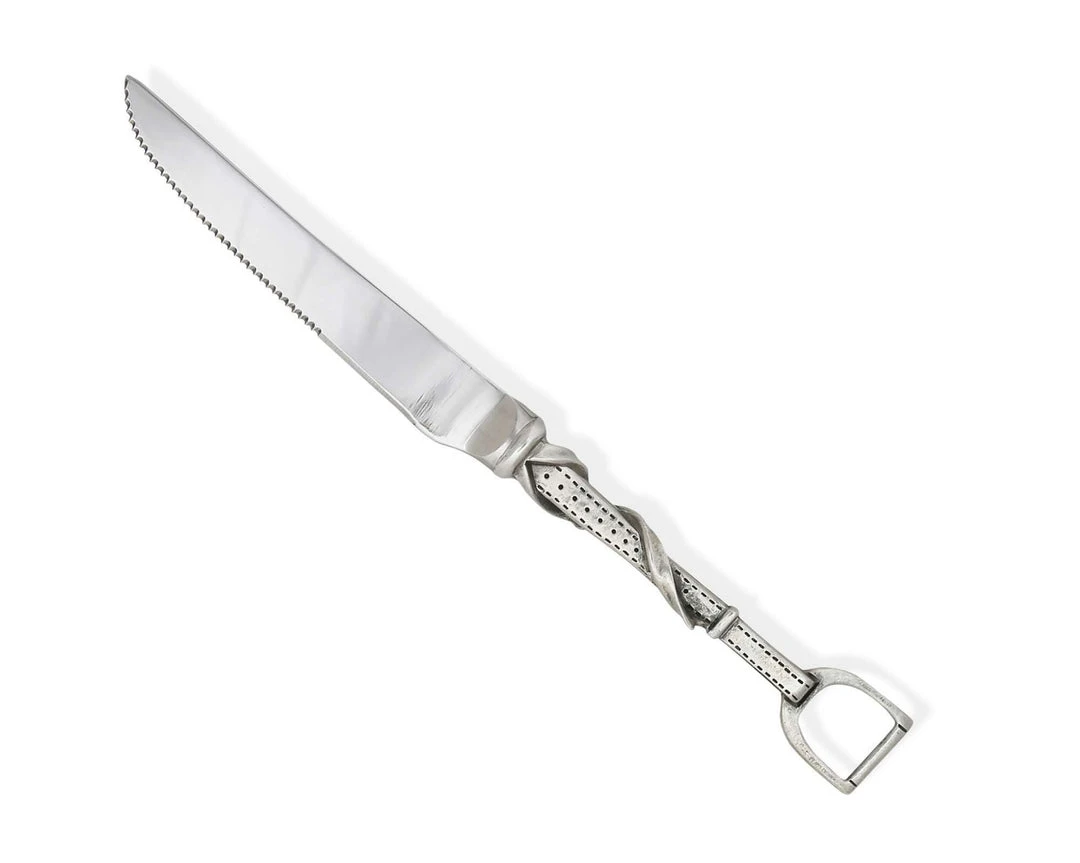 Host the next family barbecue just to show off your Vagabond House Stirrup Steak Knife Set. Pure pewter, perfectly balanced handle is hand-cast as a detailed, buckled stirrup leather ending in a classic iron.