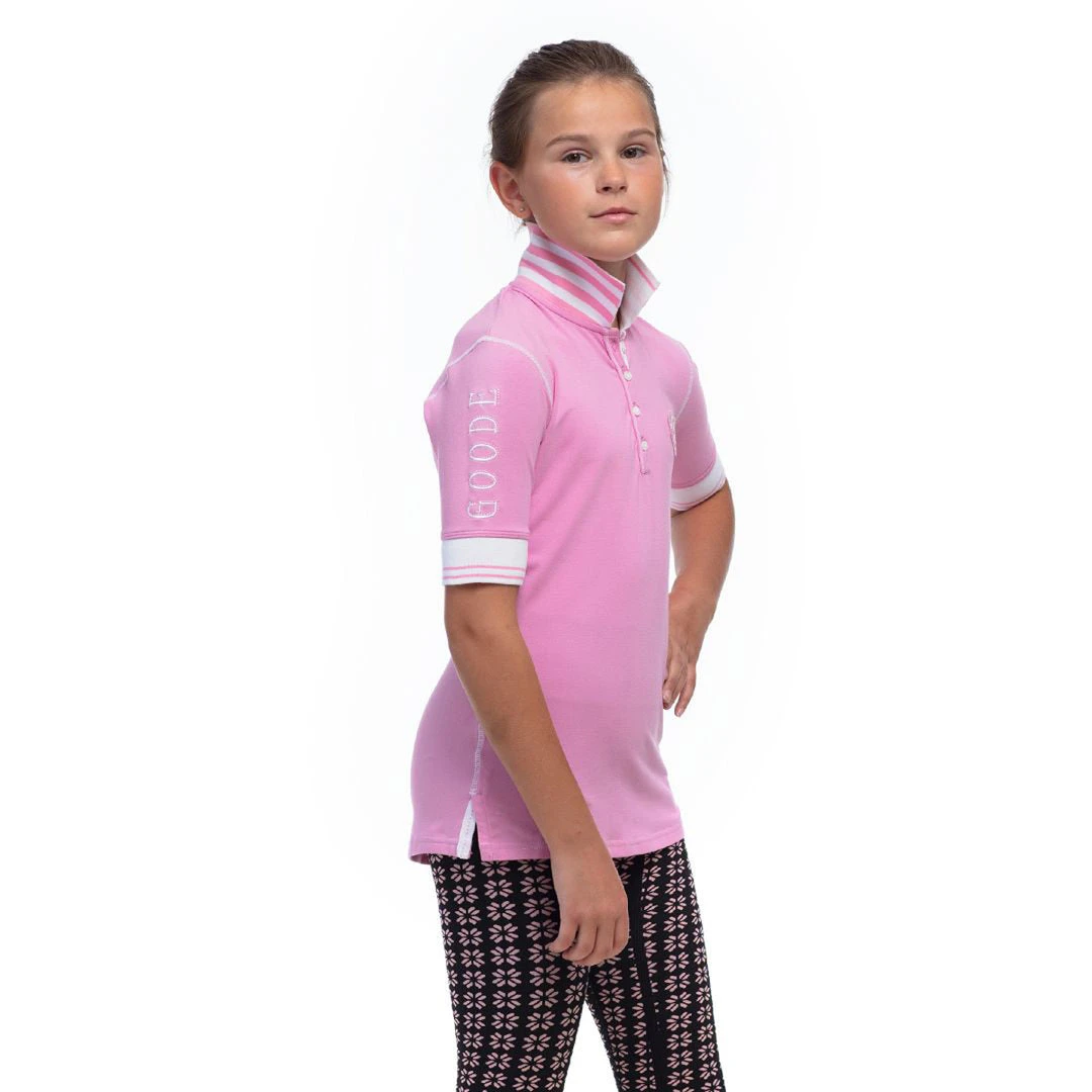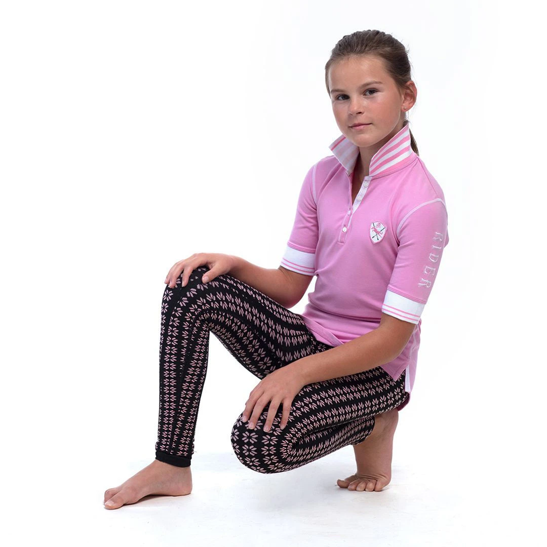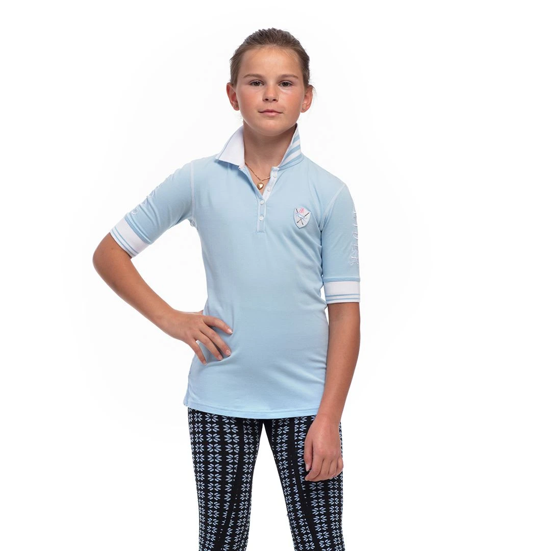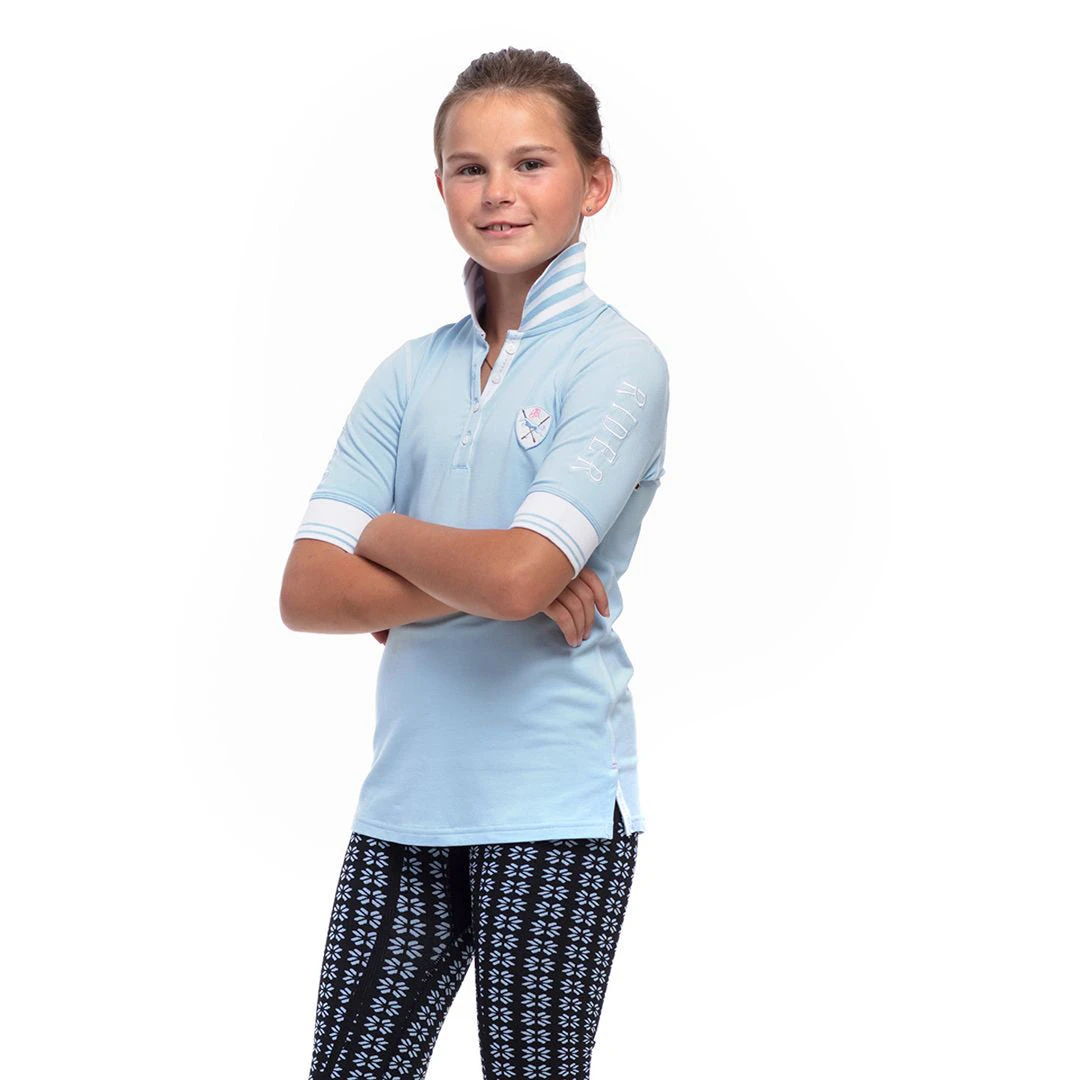 Silky yet technical this fun new polo is as functional as it is flattering. Slightly longer sleeve with contrast logo embroidery details throughout shirt. Each colorway has a different embroidery with a catchy saying in back. Ribbed Collar with a striped pattern on back, can be worn up or down. Cuff also has a ribbed banding with a stripe. Feminine mother of pearl buttons on placket. The perfect riding shirt to any clinic or just for schooling.