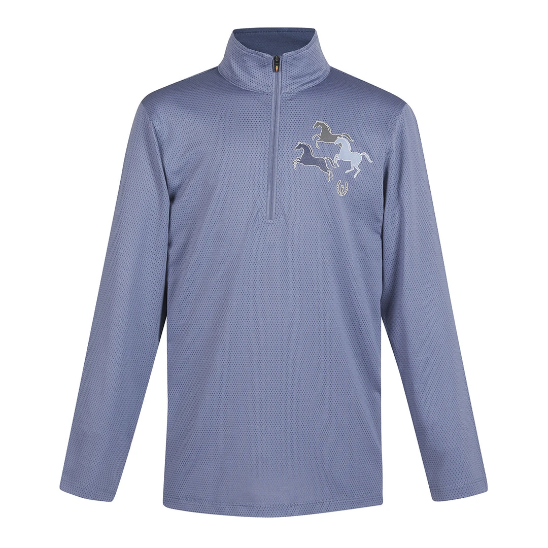 Horses dance across the chest of this featherweight cooling shirt like a colorful badge of allegiance to the pony lovers’ club. Ice Fil® fabric transforms sweat to cooling power while the long sleeves, high collar and UPF+30 sun protection blocks harmful rays. Eight-inch zip lets them control ventilation.Â