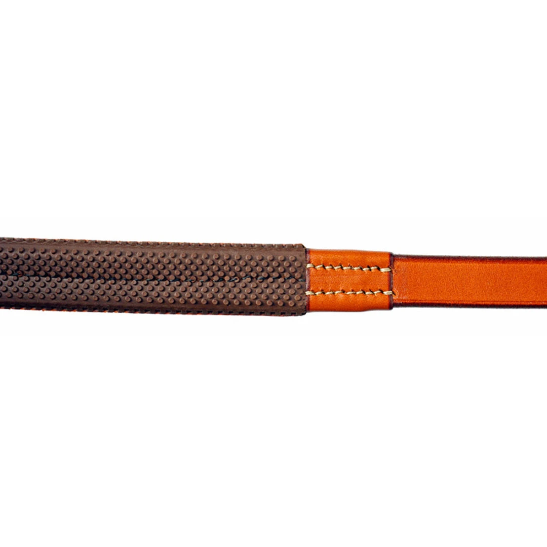 Made out of high-quality leather. A set of Edgewood reins complements any Edgewood Bridle. Edgewood reins feature full wrap-around billets, fine hand- and machine-stitching with durable nylon thread, stainless steel buckles, cast/stainless steel hook studs, and handcrafted keepers and laces. Edgewood rubber-grip reins have small-pip rubbers, imported from England, that offer a comfortable, sturdy grip in all types of weather.