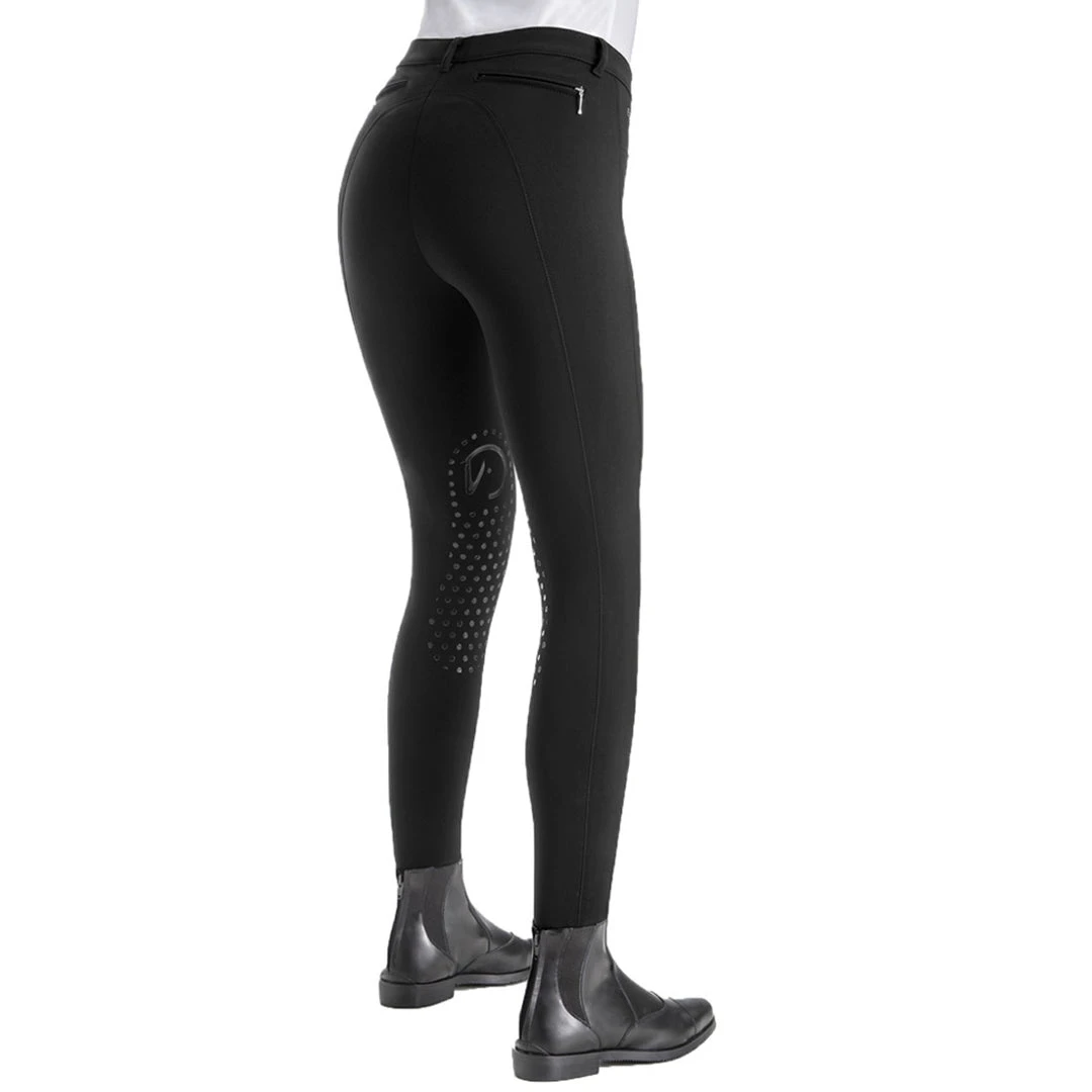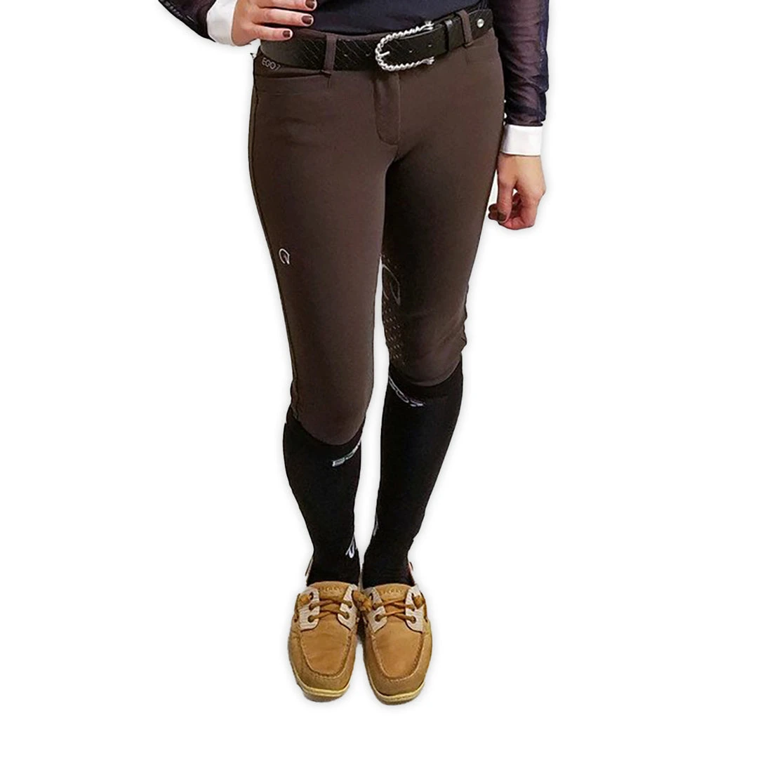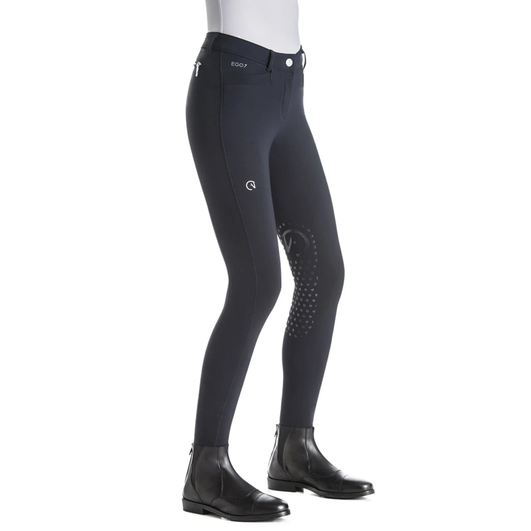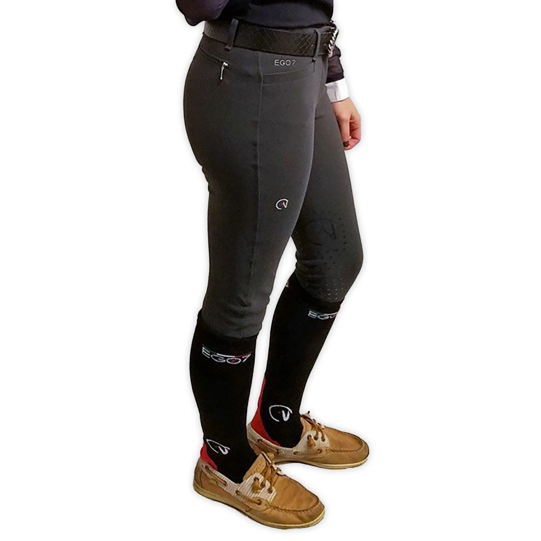 The Ego 7 style with flattering front pockets and faux zip detailing on the back gives them a fantastic look. Superior performance and style are guaranteed thanks to the signature cut and design that Italian designers developed. The revolutionary fabric, 100% jersey made in Italy, creates a perfect fit while the 4-way stretch fabric ensures unrestricted movement, support, and shape retention to give you never before felt comfort. Highly breathable, the breeches offer increased contact with the horse while riding.Â