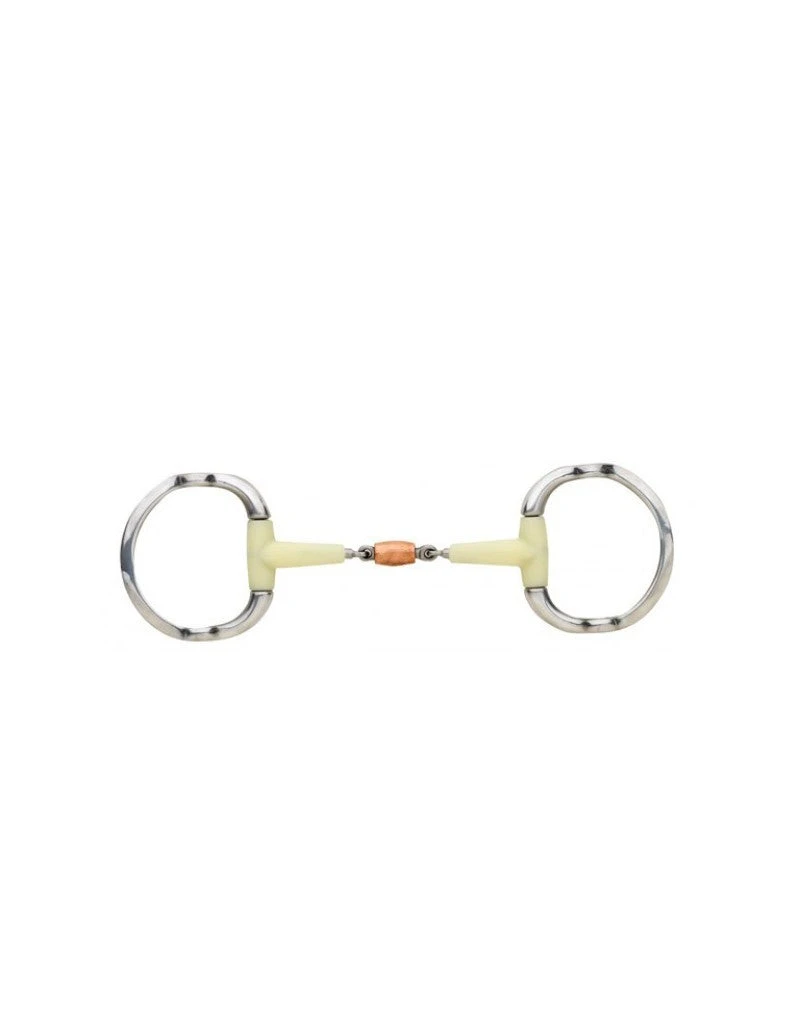 Excellent bit acceptance can be achieved by this combination of Apple scented space age polymer mouthpiece and pure copper center roller. Pure copper is a soft, warm metal. By using 99.9% pure copper in the center of the mouthpiece, bit acceptance is improved. The curved-shaped mouthpiece better fits the contours of the horse’s mouth.