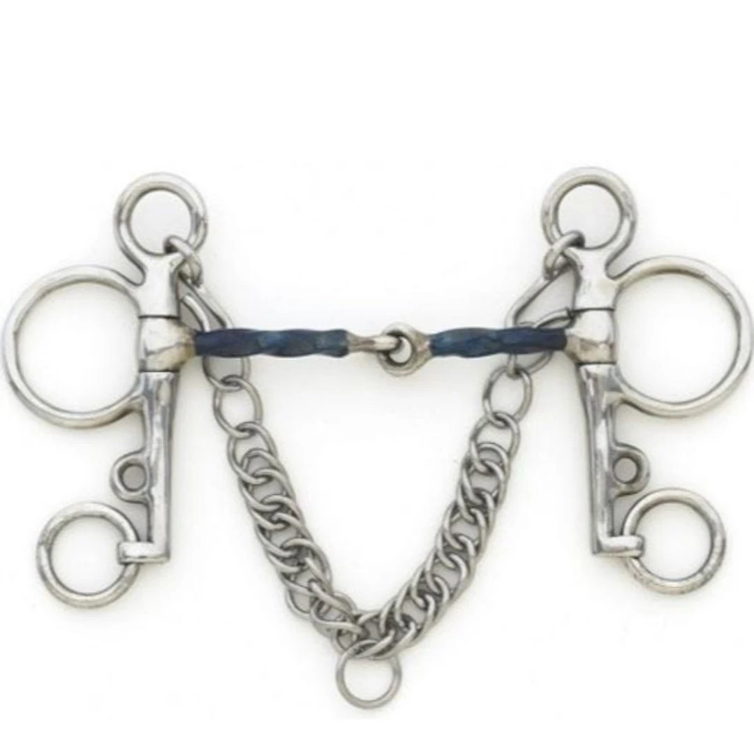 We love this Centaur® Blue Steel Slow Twist Tom Thumb Pelham Bit because it combines the action of a snaffle bit with a curb bit. The slow twist is great if you have a leaner or a non-stopper that has become dull to the normal smooth bit edge. This bit requires an expert hand. Â