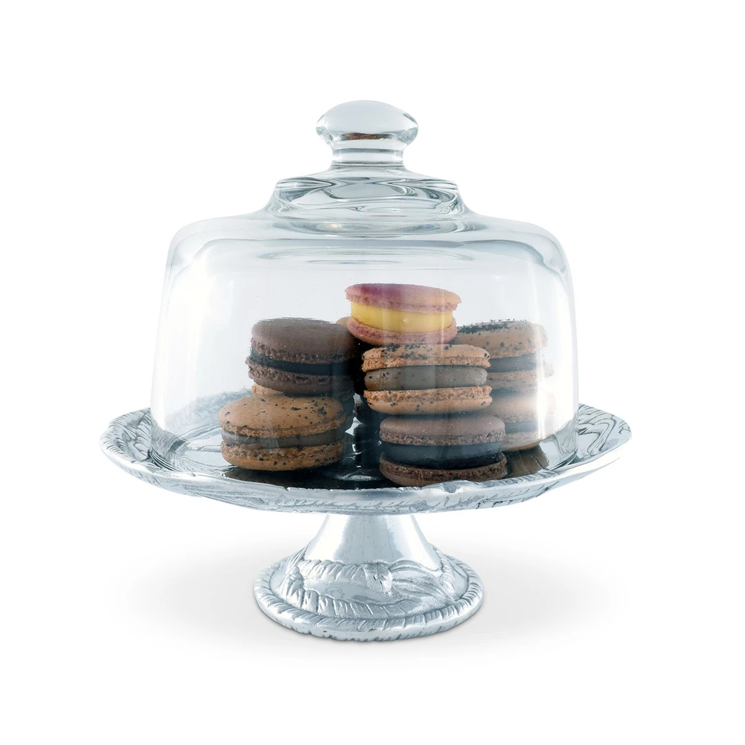 Care:Â Wash aluminum by hand with mild dish soap and dry immediately. Glass dome is dishwasher safe.