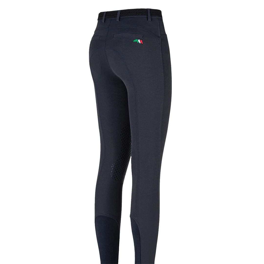 Junior girl’s knee grip riding breeches developed with a stretch and breathable material. Embellished with a tone-on-ton embroidery on the leg and a three colors logo on the back pocket. Modern design characterized by tone on tone stretch fastening system on bottom legs. Adjustable waist (internal elasticated waistband).Â