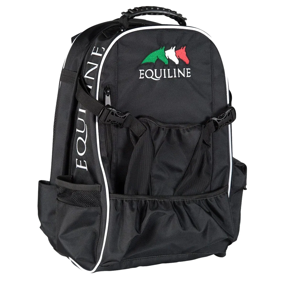The Nathan riding equipment backpack zips open to two large sections; a suitcase-like section and a mesh zip section, ideal for a change of clothes after showing. Made in sturdy nylon the Nathan backpack can handle the horse show lifestyle.  Embroidered with the Equiline Italian flag logo.