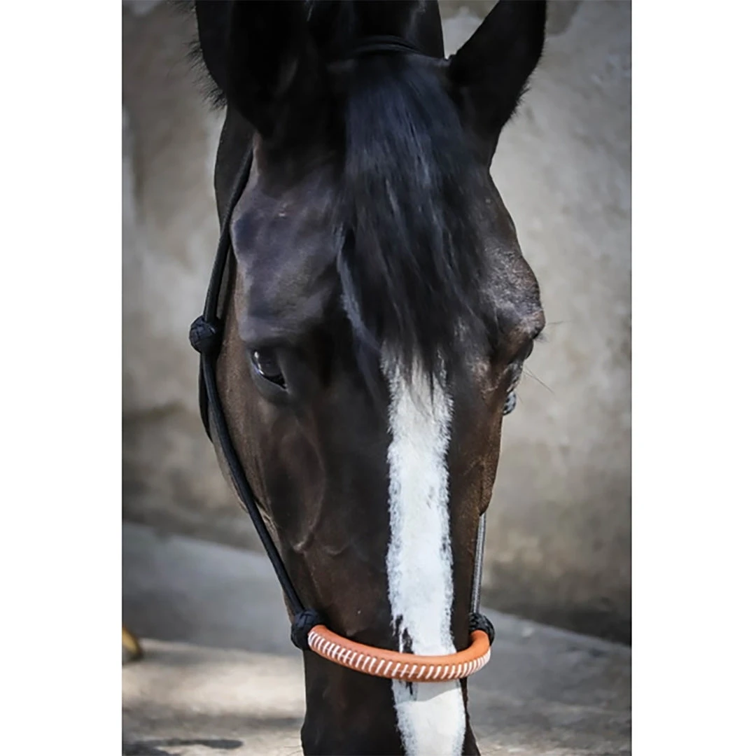 Very similar to its cousin the rope halter (available here), here is the American rope halter. This halter is made of rope, with a leather reinforcement on the noseband. The reinforcement is sewed with a thick white thread contrasting with the hazelnut leather. Fastens on the left, and can be adjusted thanks to a knot. Therefore, can match any horse size. A lead rope can be used thanks to a ring. This halter can be used for hand walking, but also for lunging.
