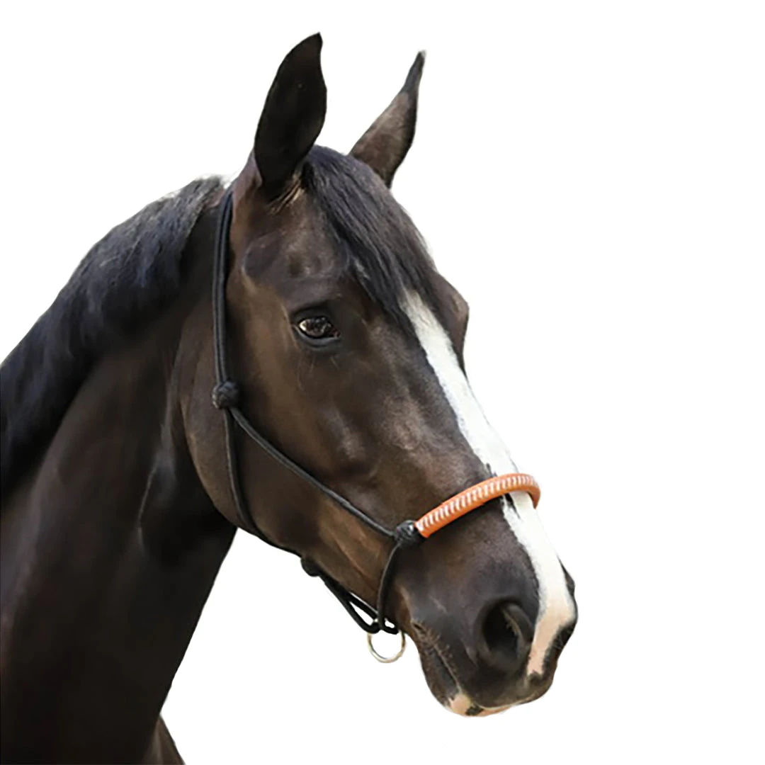 We love this halter because it is a great alternative to a chain lead rope. The leather nosepiece and strategically placed knots offer more control than a traditional halter.