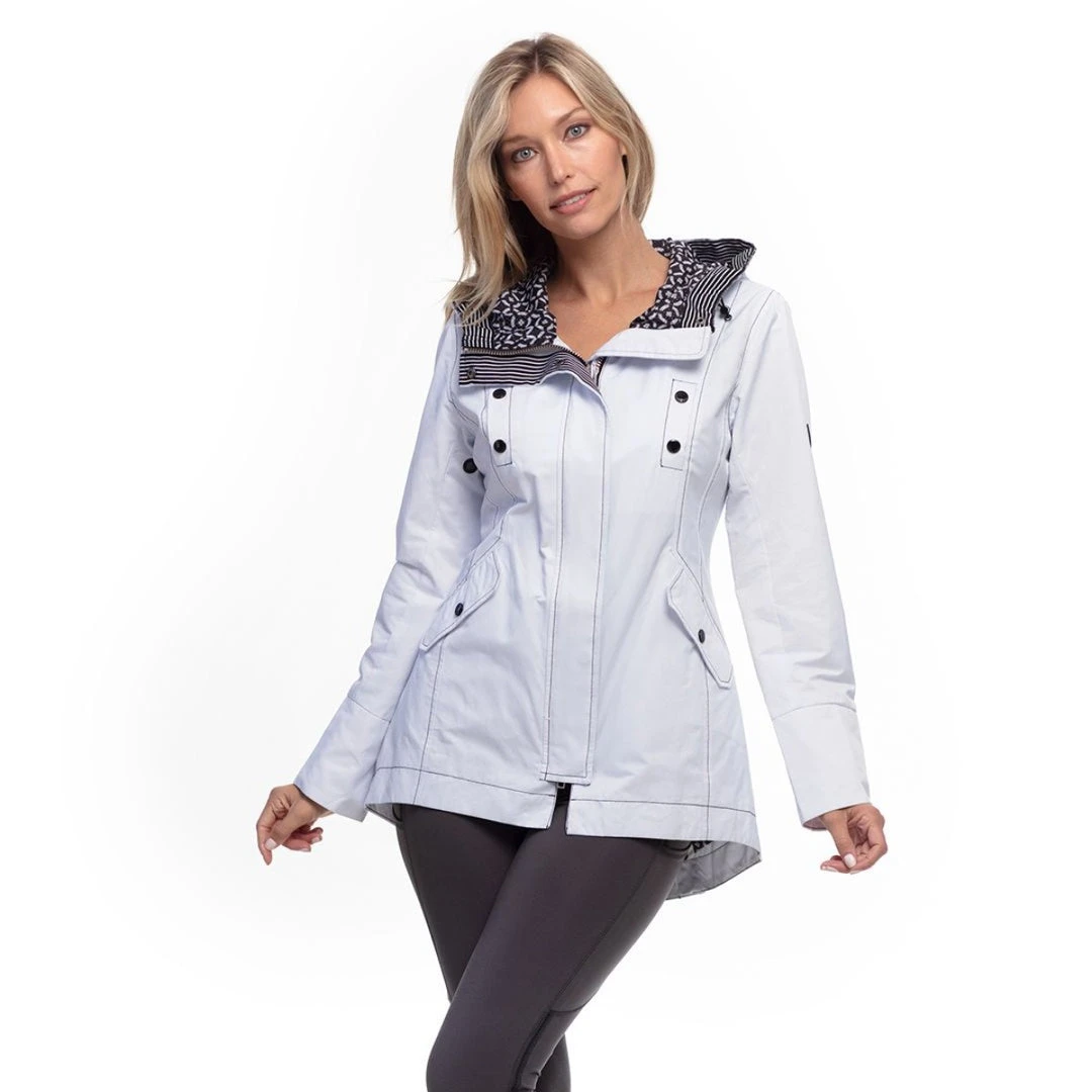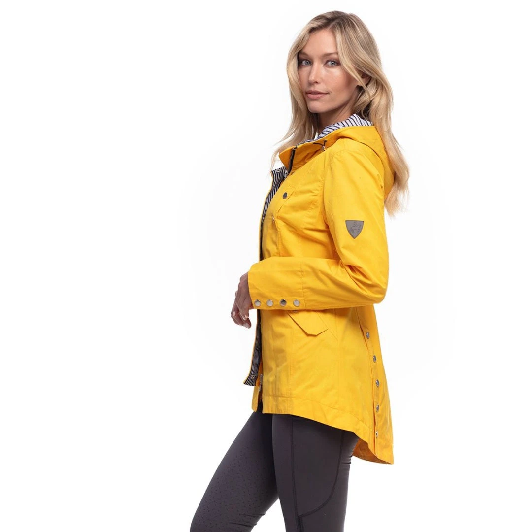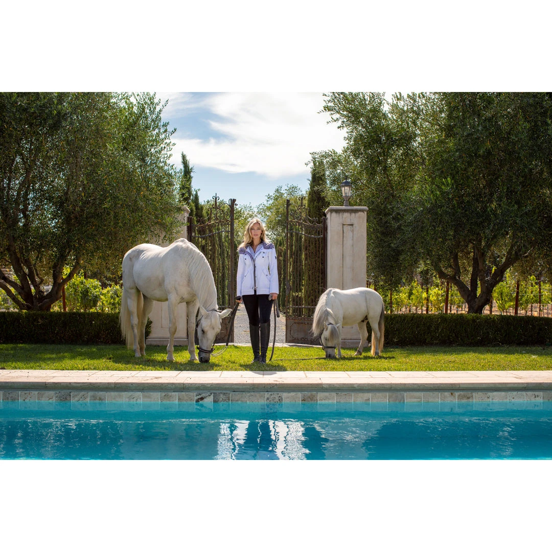 Let it rain in this stylish colorful jacket. It sure will brighten your outlook on a rainy day. Streamlined silhouette with a drawcord in back so you can get a turned in look at the waist. Multiple pockets to keep your belongings. Inside striped contrast grosgrain detailing highlights the hood and inside placket. 2 way zipper in front. A longer back with snap gussets for comfort in the saddle as well as snaps on sleeve cuffs finishes this fashionable