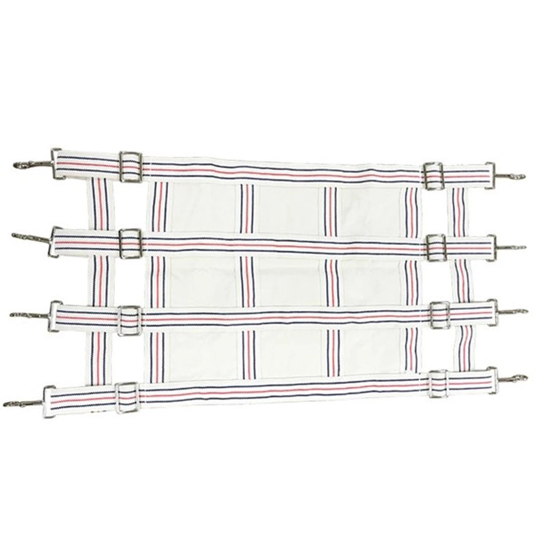 Cotton Stall Guard is made of rugged 2″ webbing stitched together. This white with royal and red striped guard is 16″ in height and adjust to 48″ in width. Heavy-duty nickel-plated hardware. Closed front to prevent the horse from putting a foot through it. Made with heavy-duty snaps.
