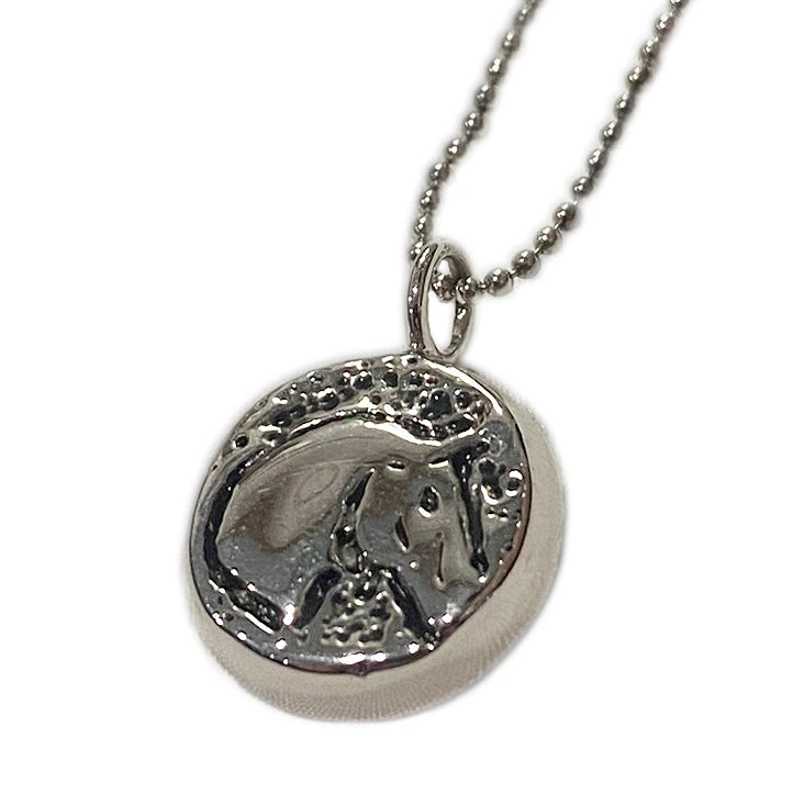 Sterling silver pendant with horse head etching on a beaded chain. Made in USA.