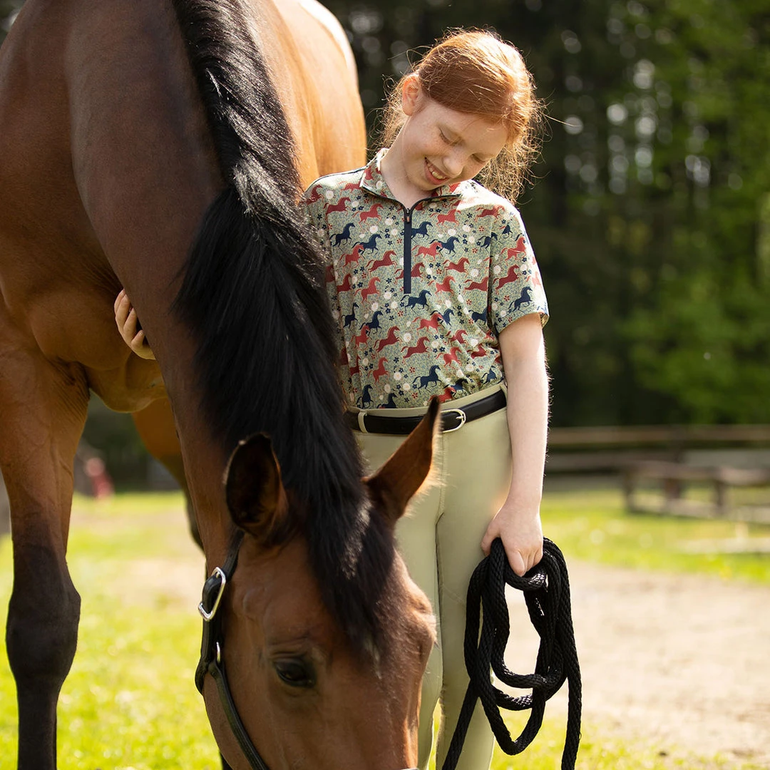 Kids will adore the fun horse and floral prints which also help hide dirt. Hi-tech Ice Fil® fabric cools their skin temperature, but never their enthusiasm for all things equine. High collar and UPF+30 sun protection blocks harmful rays. Eight-inch zip for additional ventilation.