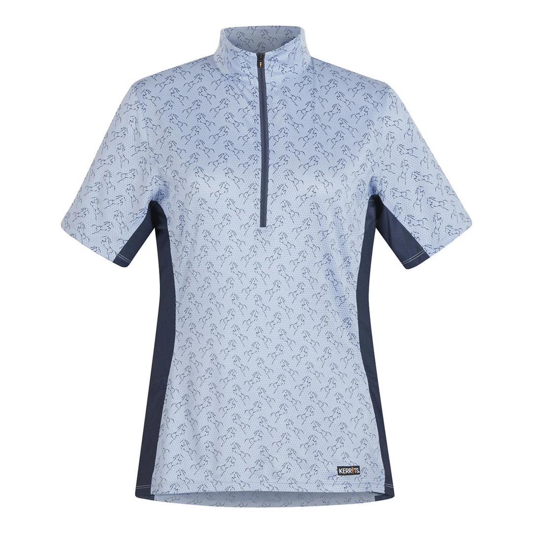 Prints keep it fun (and hide dirt) while Ice Fil® delivers serious cooling power in a whisper light performance shirt that protects you from the sun with UPF+30 and a tall stand-up collar. Ten-inch front zip boosts ventilation. Sporty, feminine fit and contrast side panels flatter, and match your favorite Kerrits tights and breeches. Handy side pockets let you pack lip stuff and horse cookies.