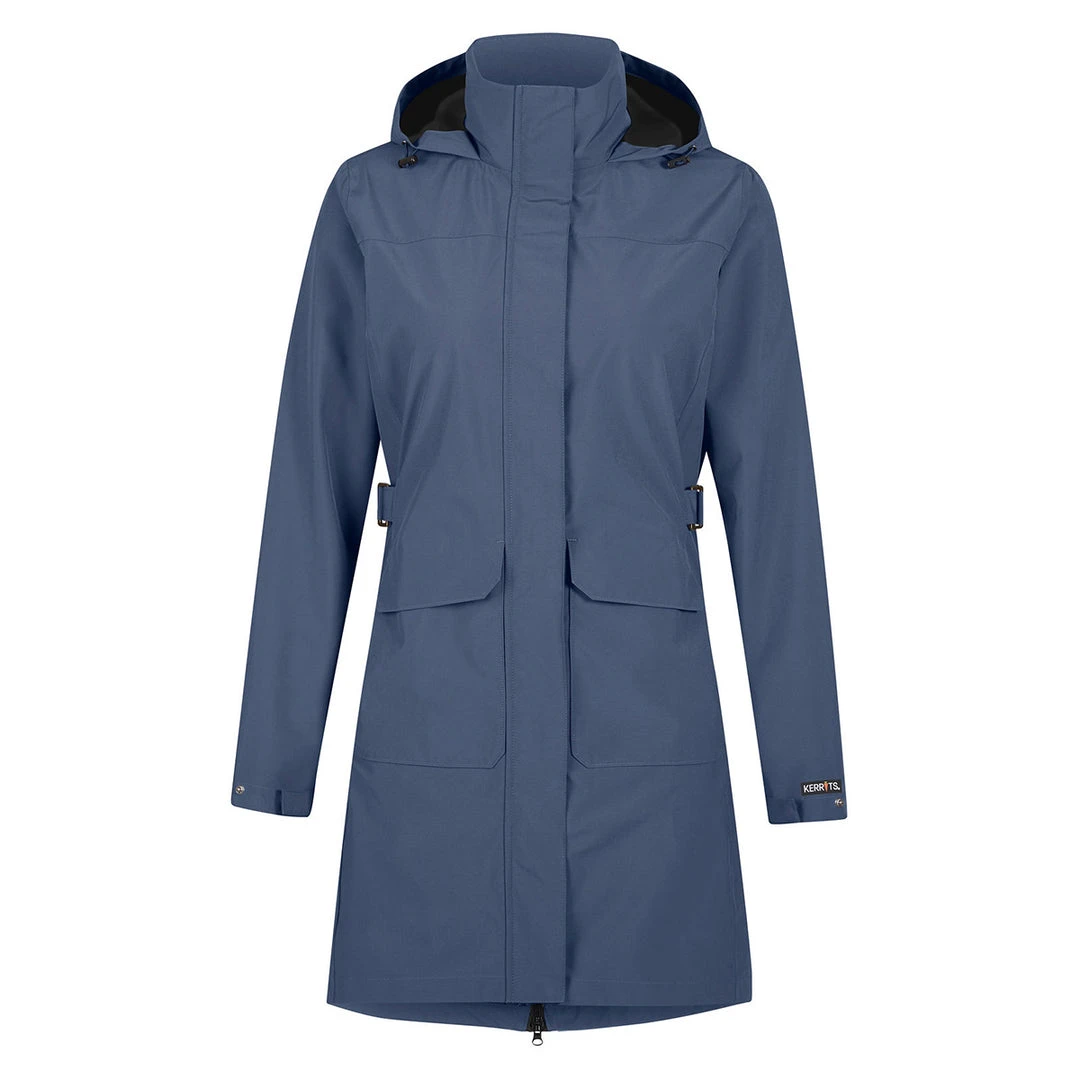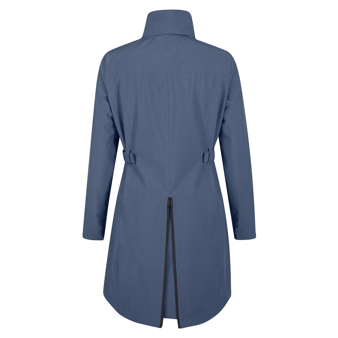 Riders stay completely dry in this fully seam sealed rain jacket made for riding through summer storms. Mud may slow things down, but the stretchy fabric frees riders to go for it while staying dry with strategic external storm flap, classic split tail and stowable hood. Adjustable buckles at the waist allow riders to customize the stylish silhouette of this flattering hip and thigh-covering coat.