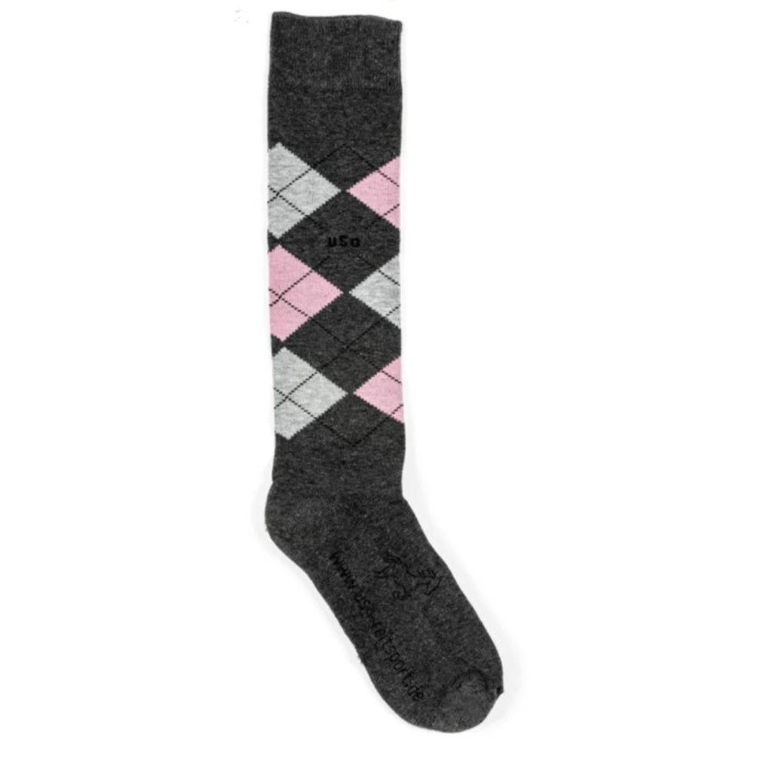The USG Karo Socks feature a padded foot bed for comfort and are available in a variety of bright color combinations. These classic argyle socks also boast an elastic cuff at the top to prevent them from sliding down and are just the right thickness to fit perfectly in your boots. Perfect for use when riding or everyday.