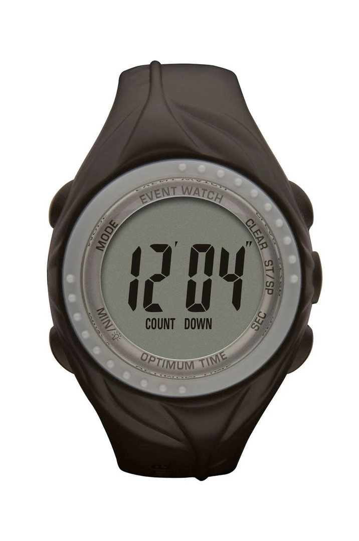Available in Black Only. “THE ULTIMATE COMPACT EVENT WATCH” IS A WATERPROOF TIMER WITH A JUMBO DISPLAY AND FEATURES A CLOCK, A COUNT UP FROM ZERO, A COUNTDOWN FROM A PRESET, WITH AN ALARM.