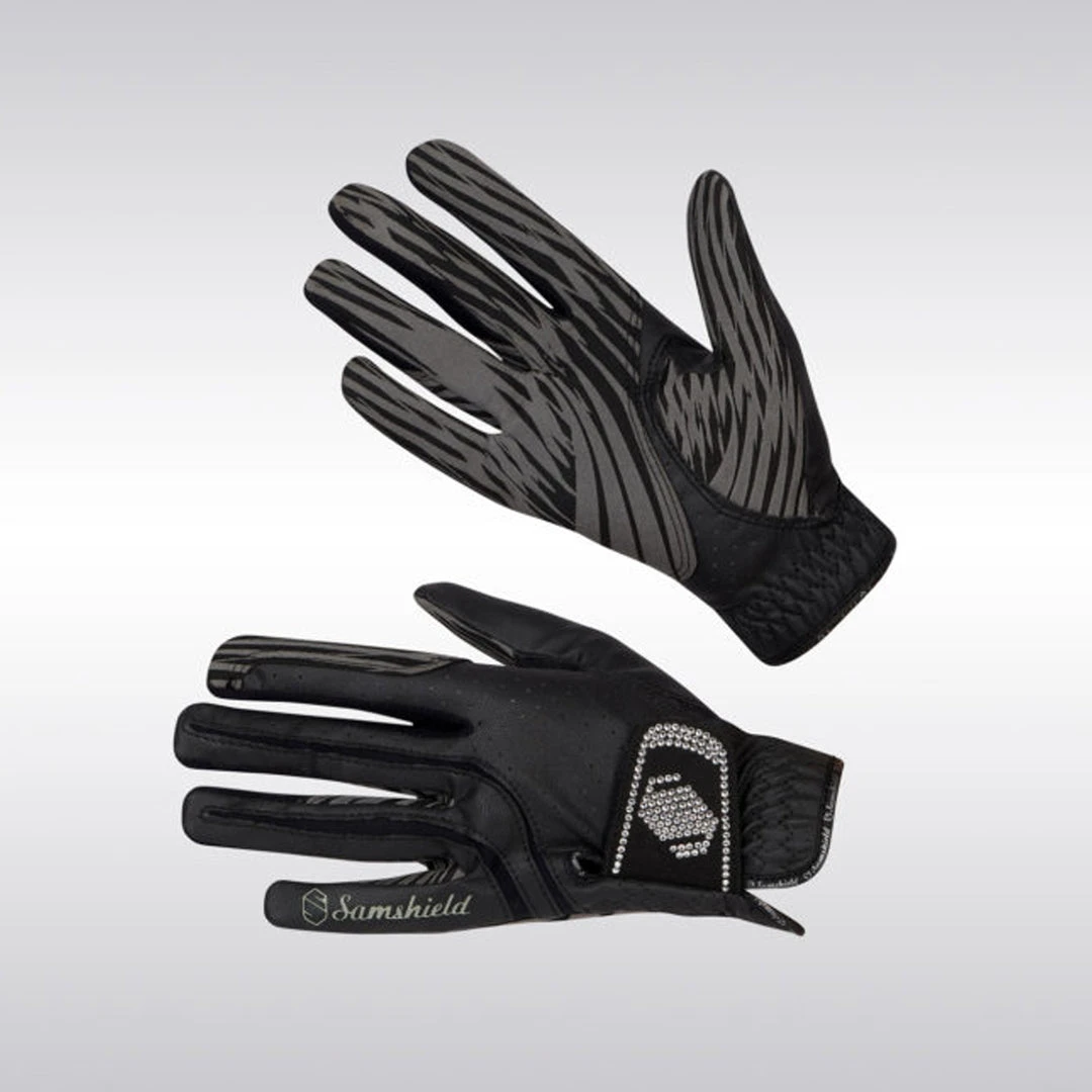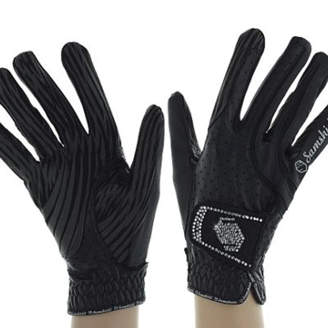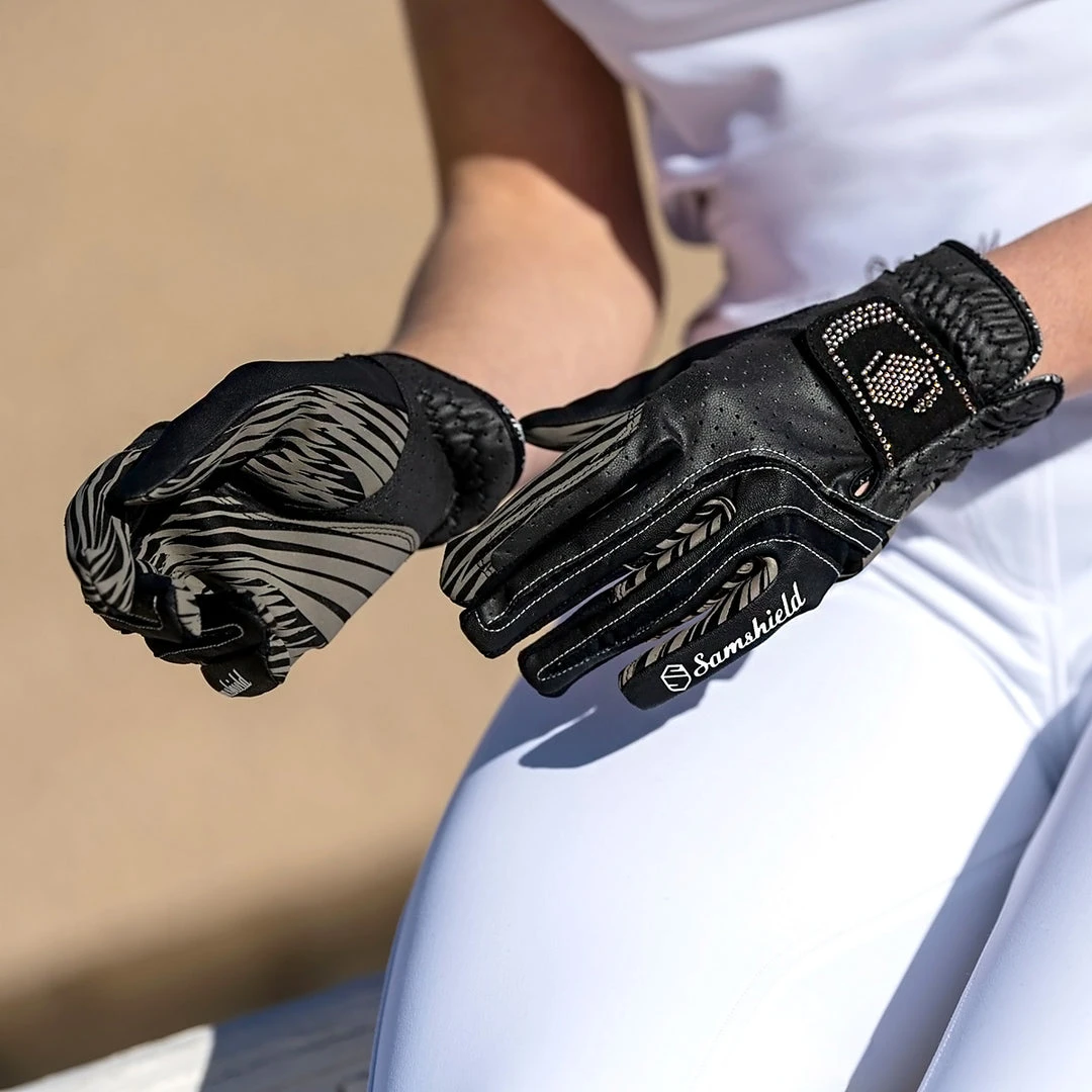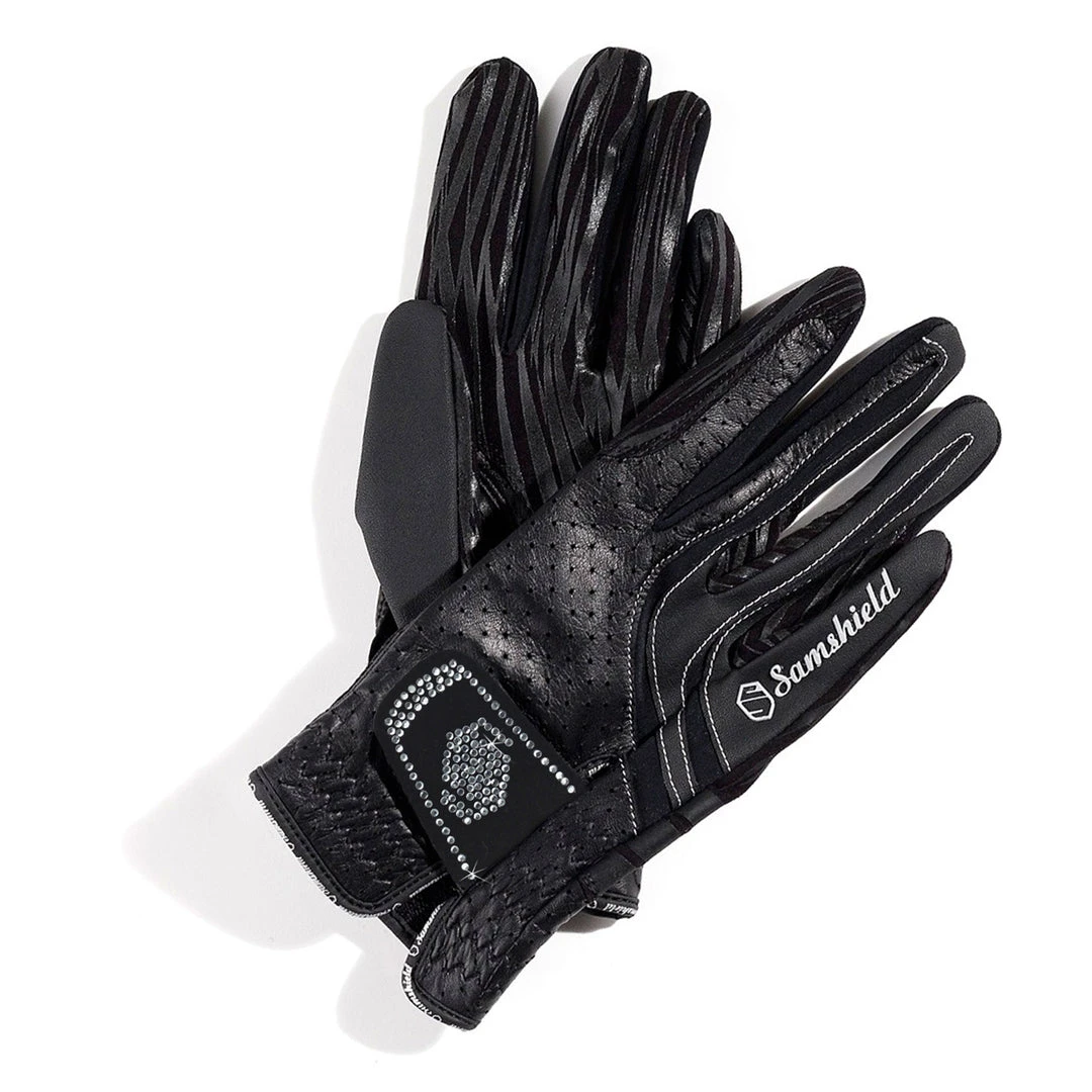 Durable and strong for every day schooling, stylish and sleek for the show ring. Constructed of ultra thin leather and strong Lycra which allows for extreme flexibility, perfect fit, ultra comfort, and an exceptional grip. The spandex size is doubled in the wrist to achieve a perfect wrist fit. Decorated with 130 Swarovski crystals, these gloves shine in all the right places. V-skin gloves are professionally crafted with the quality of a Samshield product and are designed to revolutionize your ride with the latest technology.