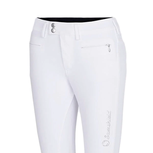 The compression fabric offers a perfect fit for the breeches. The elastic tape inside the belt is equipped with silicone which prevents the shirt from rising. The breeches are embellished with a Swarovski® Samshield logo on the rider’s thigh and Crystal Fabric Swarovski® on the back pockets combining technical performance and elegance.