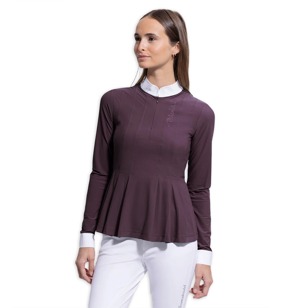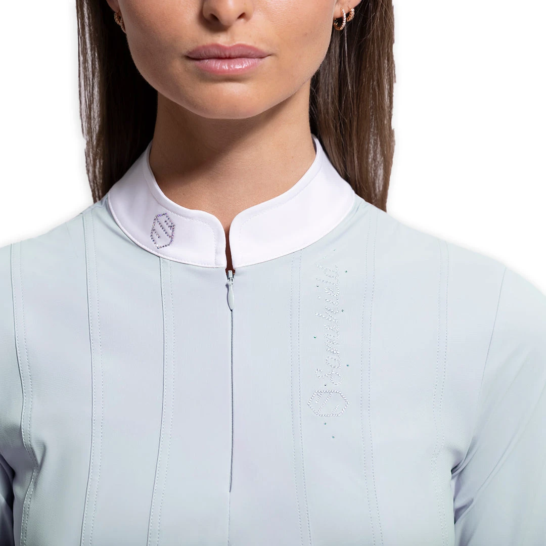 The Ninon blouse ensures femininity and distinction. Made of an ultra light, breathable and soft touch fabric, it ensures optimal comfort and ventilation. Designed with a Tulle lining in the front and back that can be tucked into breeches, the Ninon blouse provides excellent support and feminine style with ruffled inserts at the bottom. The collar of Ninon closes with an invisible zipper. It is decorated with a Swarovski® coat of arms and Crystal Fabric Swarovski® for a refined and elegant look.