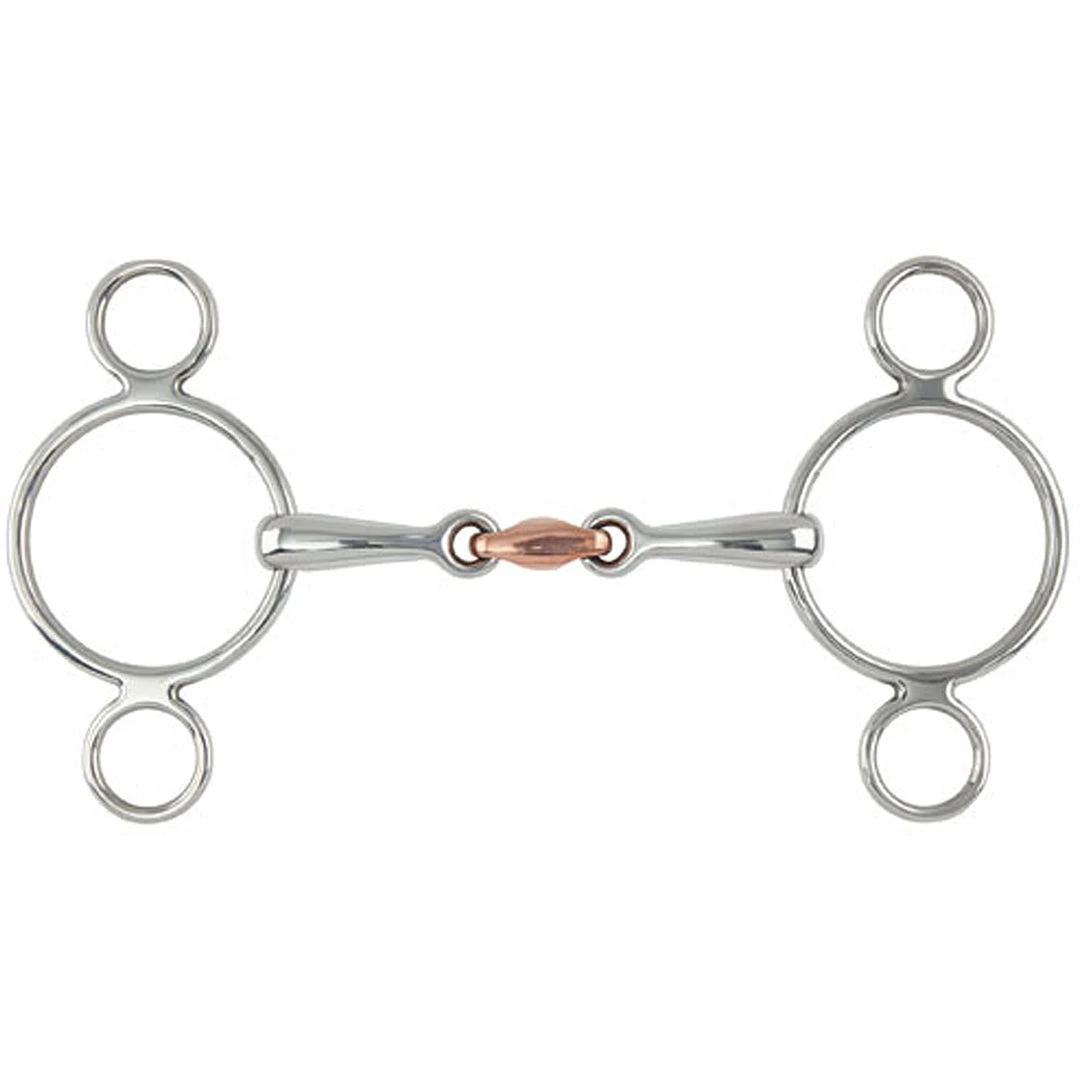 With a stainless steel mouthpiece, this bit is durable, easy to clean, tasteless, and does not rust. The addition of a copper link creates warmth and encourages salivation for a soft mouth. Two rings allow for the rein to be placed on either the main ring or a smaller lower ring for more leverage. The gags put pressure on both the bars of the mouth and the poll for increased flexion and lower head carriage.