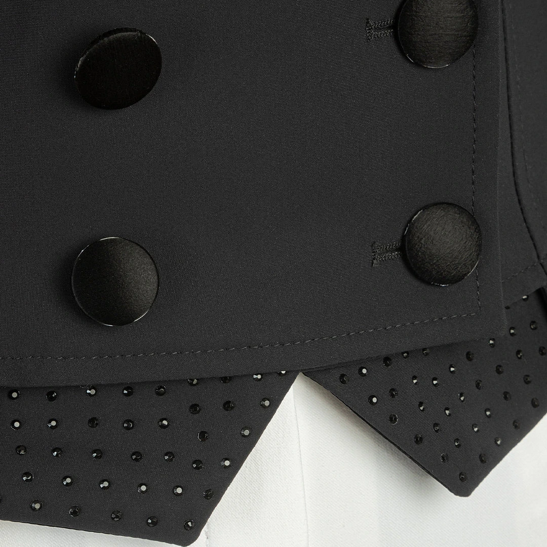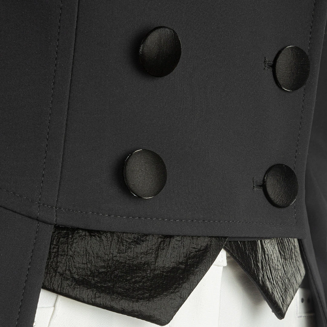 Elegant tailcoat/shadbelly constructed with B-Move fabric. Showcasing a velvet/leather look detailing on the collar and buttons. Choose from either a matching set of points, or flip them over for sparkly rhinestones.