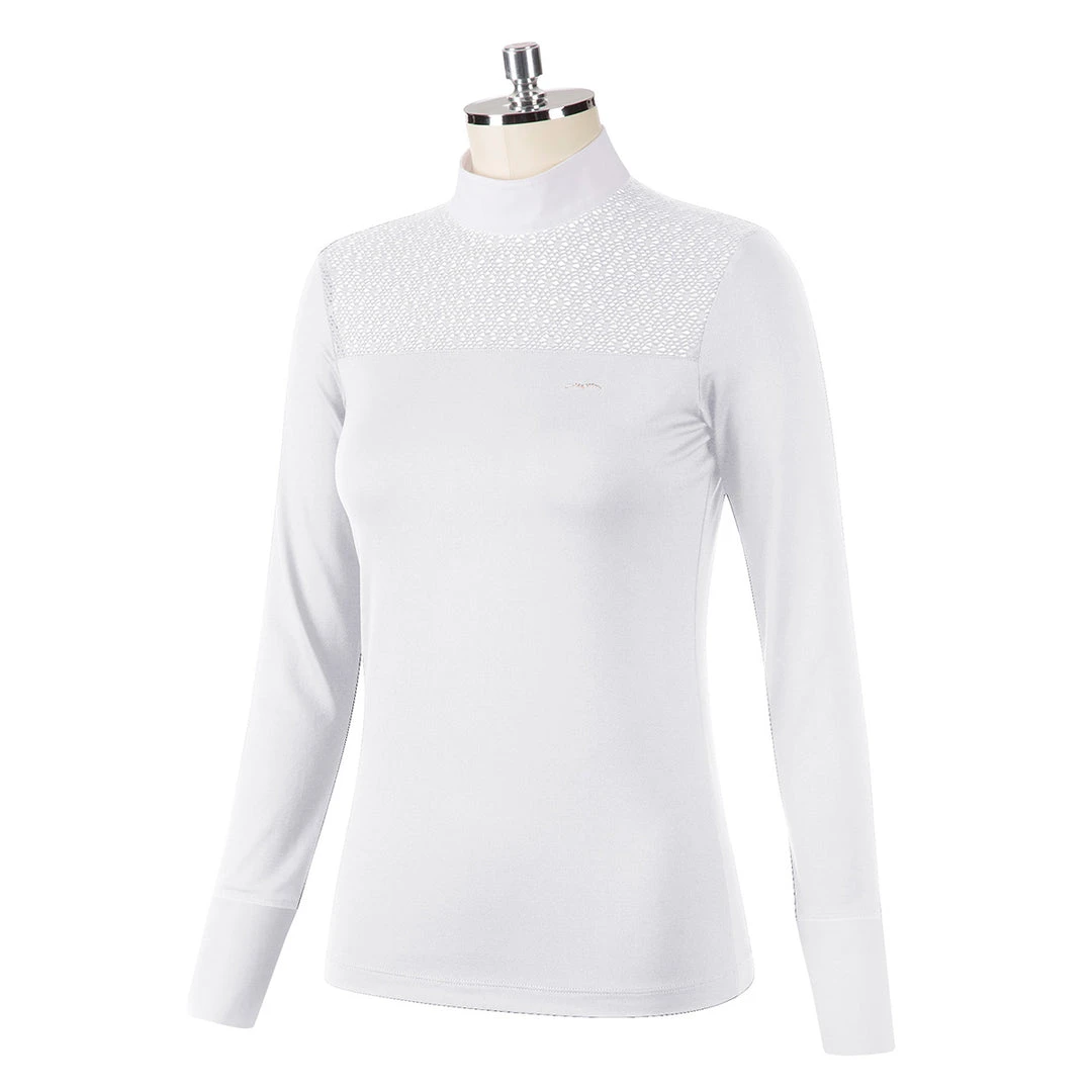 The Baxe is an elegant shirt for top level competitors. Made with high performance materials designed to wick away moisture and move with you as you ride. Features crochet front detailing, crystal Animo logo, and white collar and cuffs.