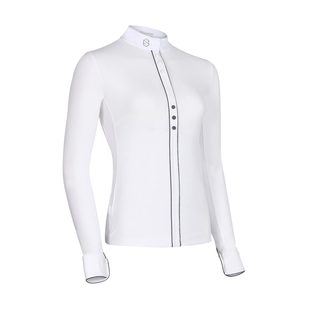The Harper long-sleeved competition shirt is made from breathable stretch material in technical backstitch. Its tight fit ensures perfect comfort and excellent support. The collar has been festooned with a Samshield logo of metallic dots, and its braids and buttons are covered with iridescent fabric. Available in White with Grey Piping.
