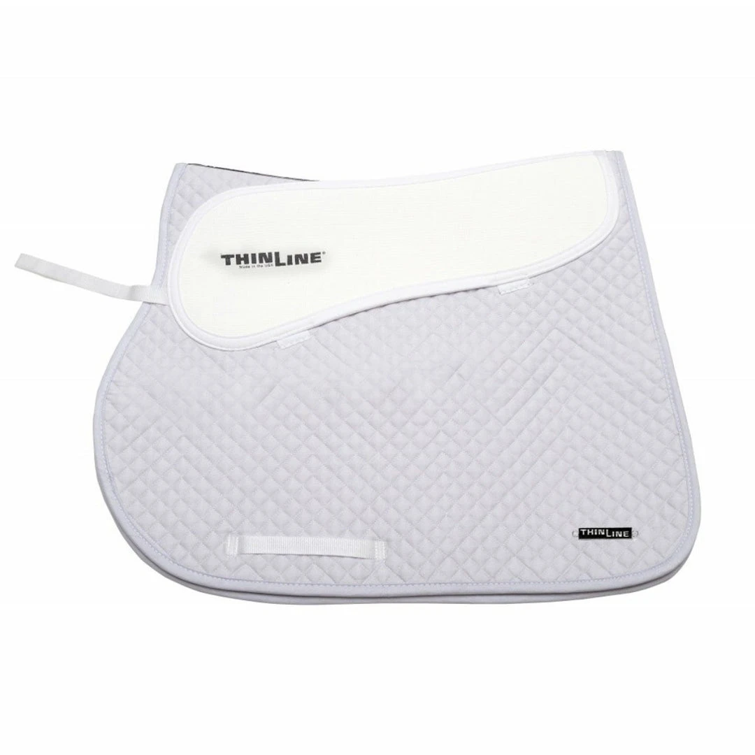 Ease of use and a perfect fit are hallmarks of this English cotton saddle pad. When using this full saddle pad your ThinLine is always in the right place. It eliminates the need to use multiple pads, thereby reducing tack up time and unnecessary thickness. The 95% shock absorption rate and no-slip properties of ThinLine mean you have all you need for equine comfort and protection. Easy to wash, feel free to bleach the white ones.