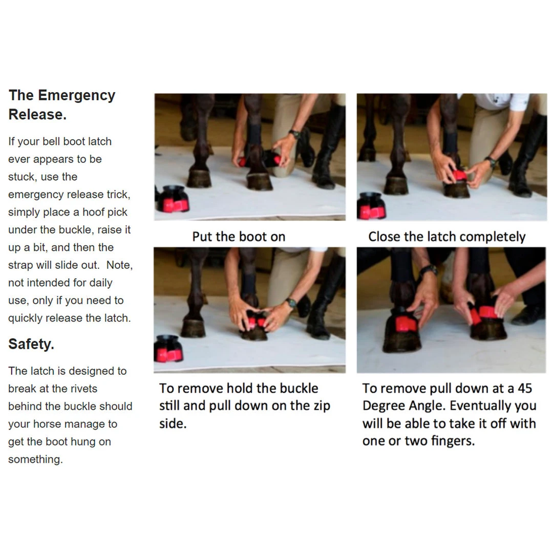 If your bell boot latch ever appears to be stuck, use the emergency release trick, simply place a hoof pick under the buckle, raise it up a bit, and then the strap will slide out. Note, not intended for daily use, only if you need to quickly release the latch. The latch is designed to break at the rivets behind the buckle should your horse manage to get the boot hung on something. Designed for longevity. The bell portion is made of the highest strength polymers (not found in any other bell boot). Designed primarily as a turnout boot. The patented neck and latch design allows this boot to fit without rubs. GatorBootz is the most durable bell boot on the market.