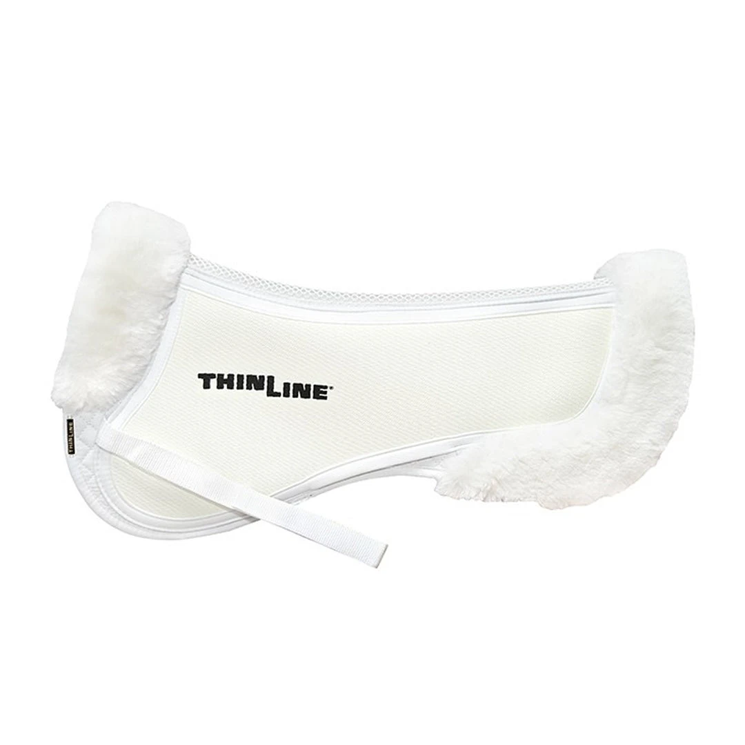 ThinLine Trifecta Half Pad with Sheepskin Rolls Reduce Rider Movement, Protect Horses’ Backs, Improve Saddle Fit. The cotton base design with ThinLine on top creates a nice wither profile and the spine-free channel allows ThinLine to lay on either side of the spine so that it is always in the right place.  It is the dual benefit of extraordinary shock absorption and rider motion reduction that sets ThinLine apart from other saddle pads.  Now with a longer drop. The ThinLine panel has been enlarged to protect below the stirrup bar. The larger pocket allows you to shim more behind the point of the shoulder.  Trifecta Lays flat to easily combine with other base pads.
