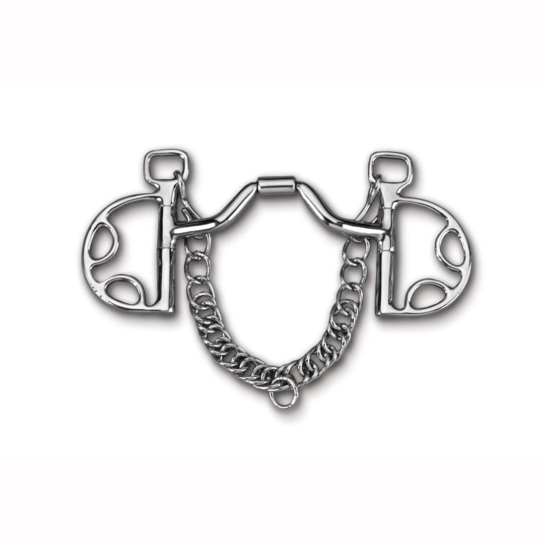 Notes: The Kimberwick is a “D” shaped stainless steel ring with a purchase for the headstall and two attachment options for a single pair of reins: the direct (snaffle) and the indirect (curb) positions. Comes with a curb chain. Like the Pelham, the purchase creates a fixed cheek so the bit is held in the correct position. The rider can choose the direct (snaffle) position or indirect (Curb) position for rein attachment. The Indirect Rein position adds very little to mild leverage. Designed to be used with only one pair of reins.