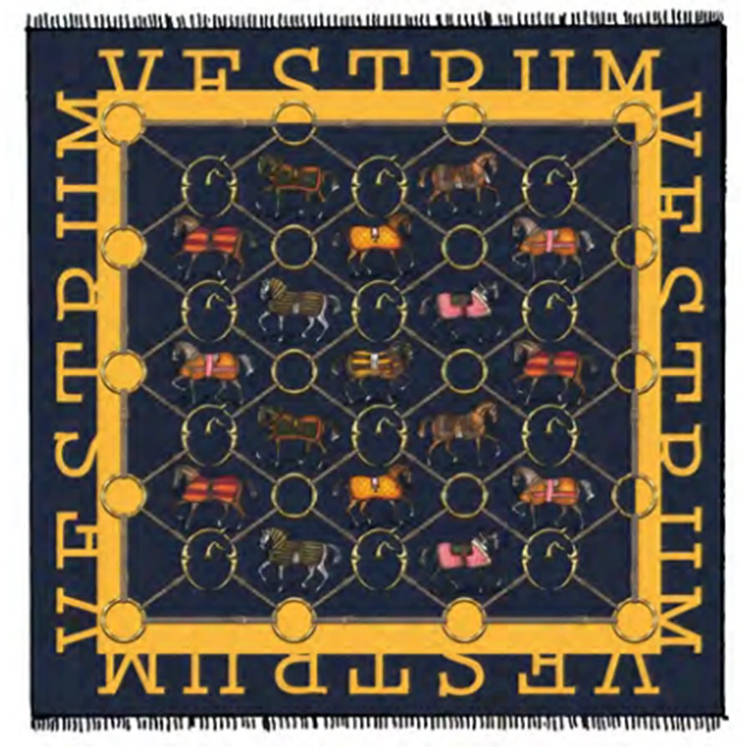 Elegant 100% superfine cashmere shawl emblazoned with original equestrian pattern.Â