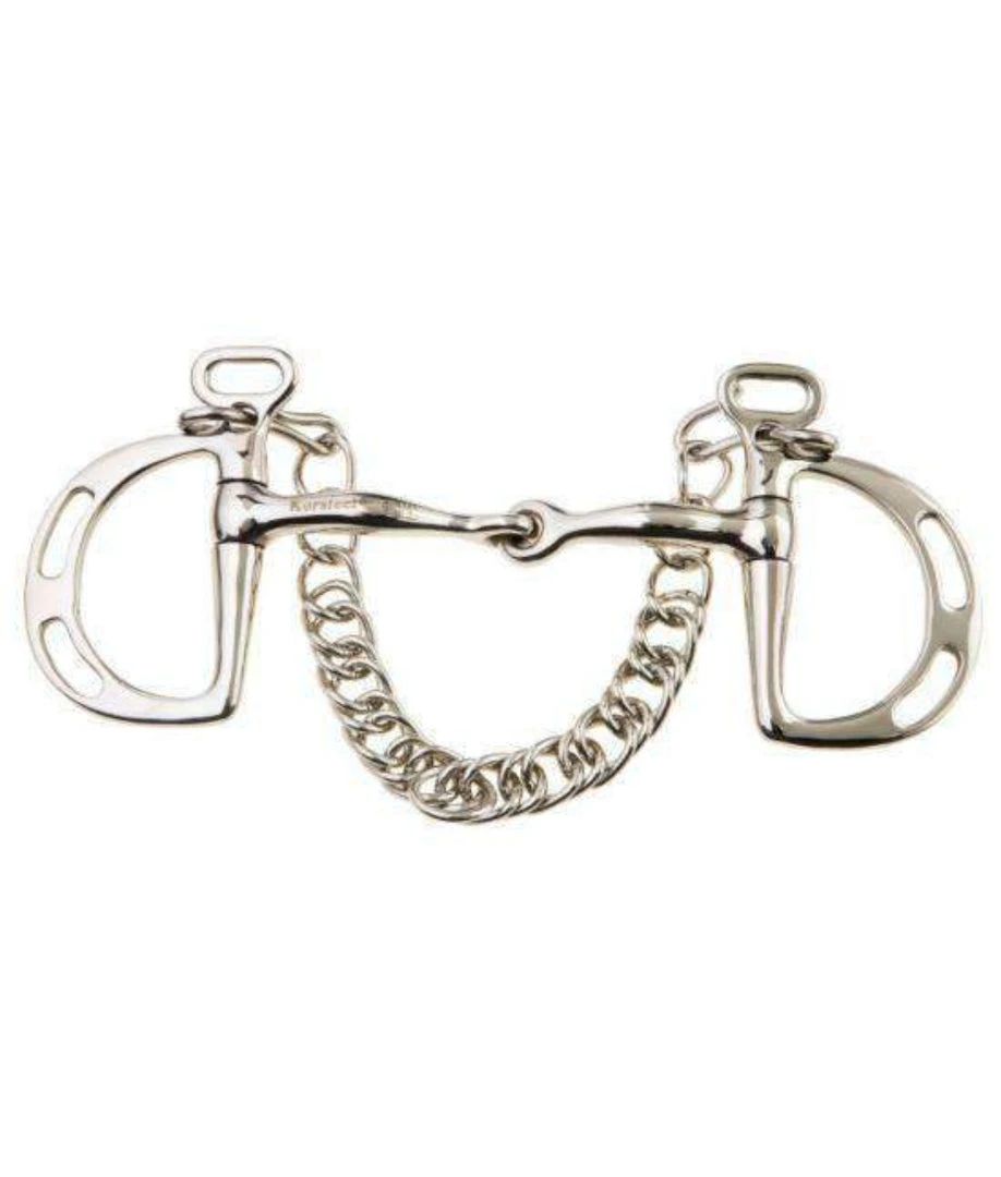 We love the JP Korsteel Stainless Steel Jointed because it combines the action of a snaffle and curb into one bit through one rein. The curved mouthpiece eliminates the nutcracker action of the joint hitting the roof of the mouth and tongue being pinched. This bit is for experienced hands. Â